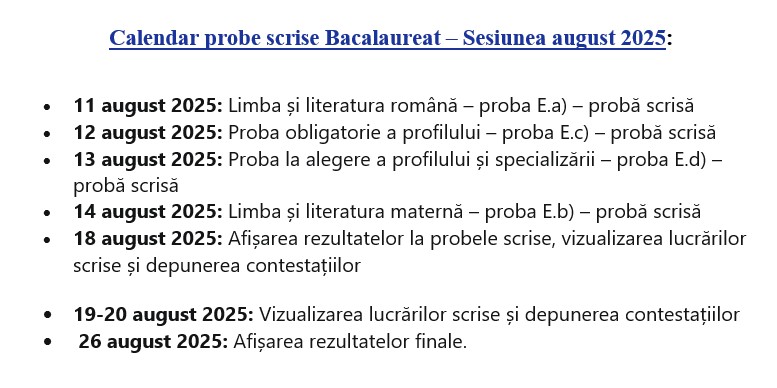 Absolvenții liceului nostru care s-au înscris la sesiunea din august 2025 a examenului de Bacalaureat, vor susține probele scrise la Centrul de Examen organizat la Liceul Teoretic „Miron Costin”, Iași, strada Mușatini, nr. 12, cartierul „Alexandru cel Bun”.