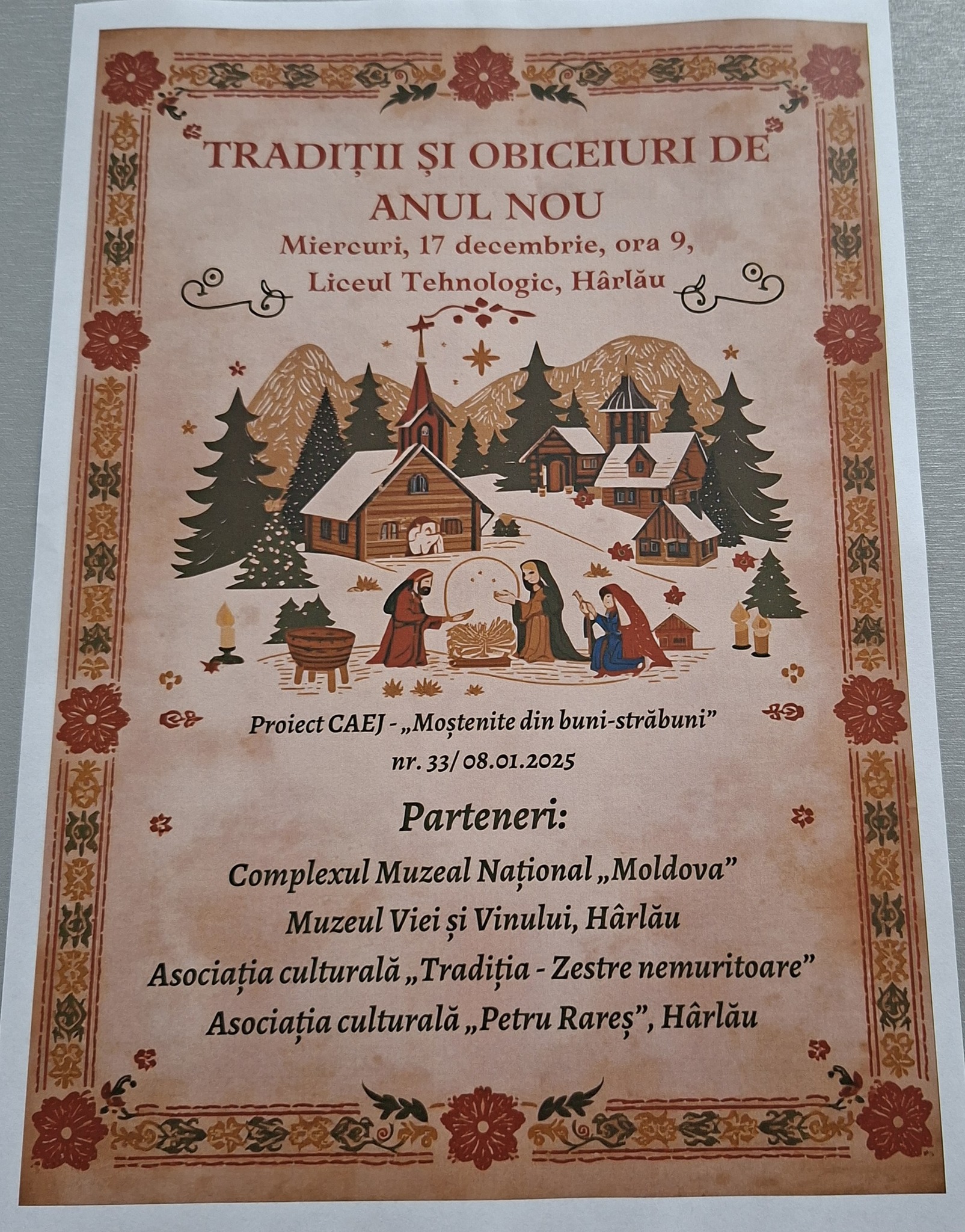 „TRADIȚII ȘI OBICEIURI DE ANUL NOU” – Activitate inclusă în Proiectul CAEJ - „Moștenite din Buni – Străbuni”, organizată de liceul nostru în parteneriat cu Muzeul Viei și Vinului Hârlău - Complexul Muzeal Național „Moldova”, Asociația Culturală „Tradiția – Zestre Nemuritoare” și Asociația Culturală „Petru Rareș” Hârlău.
