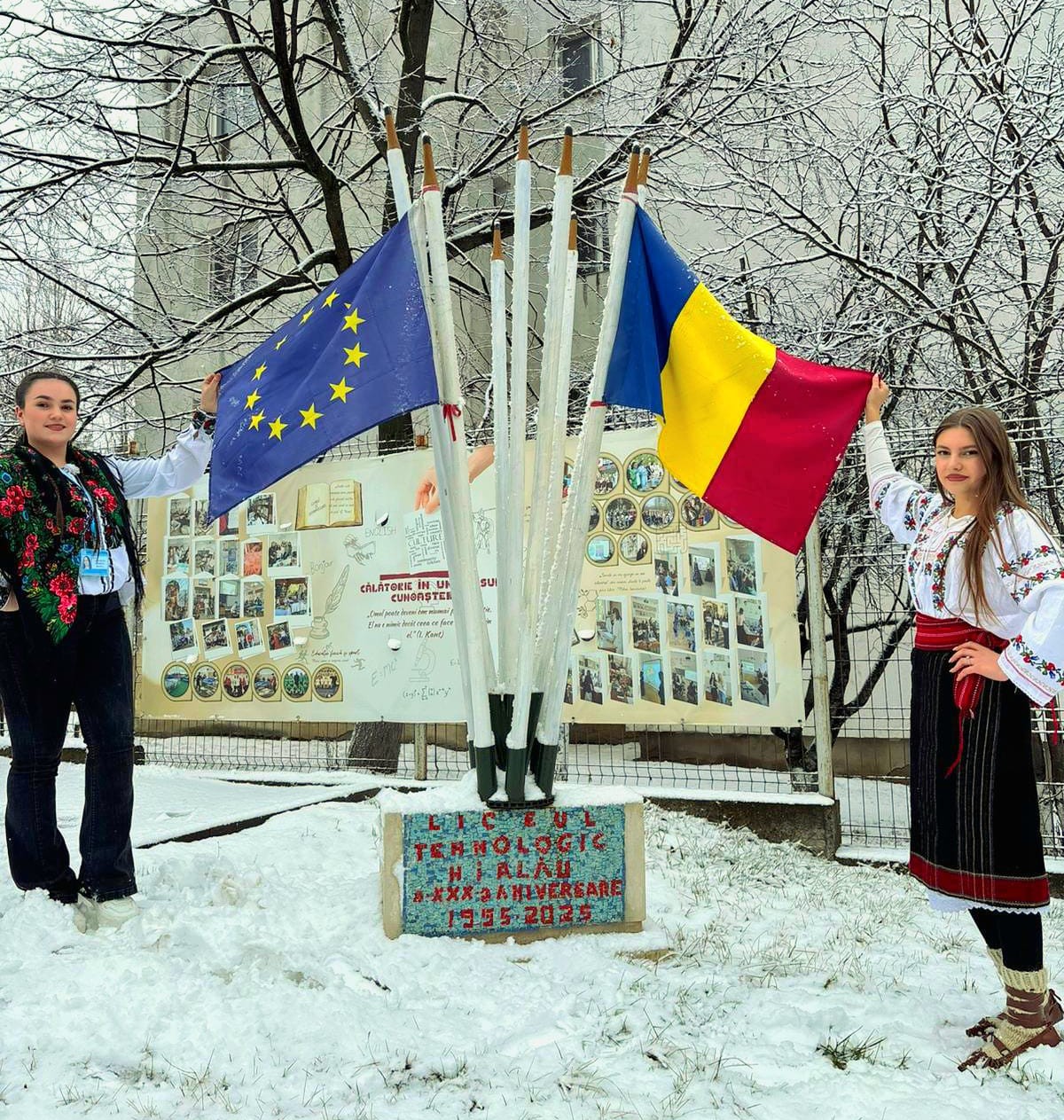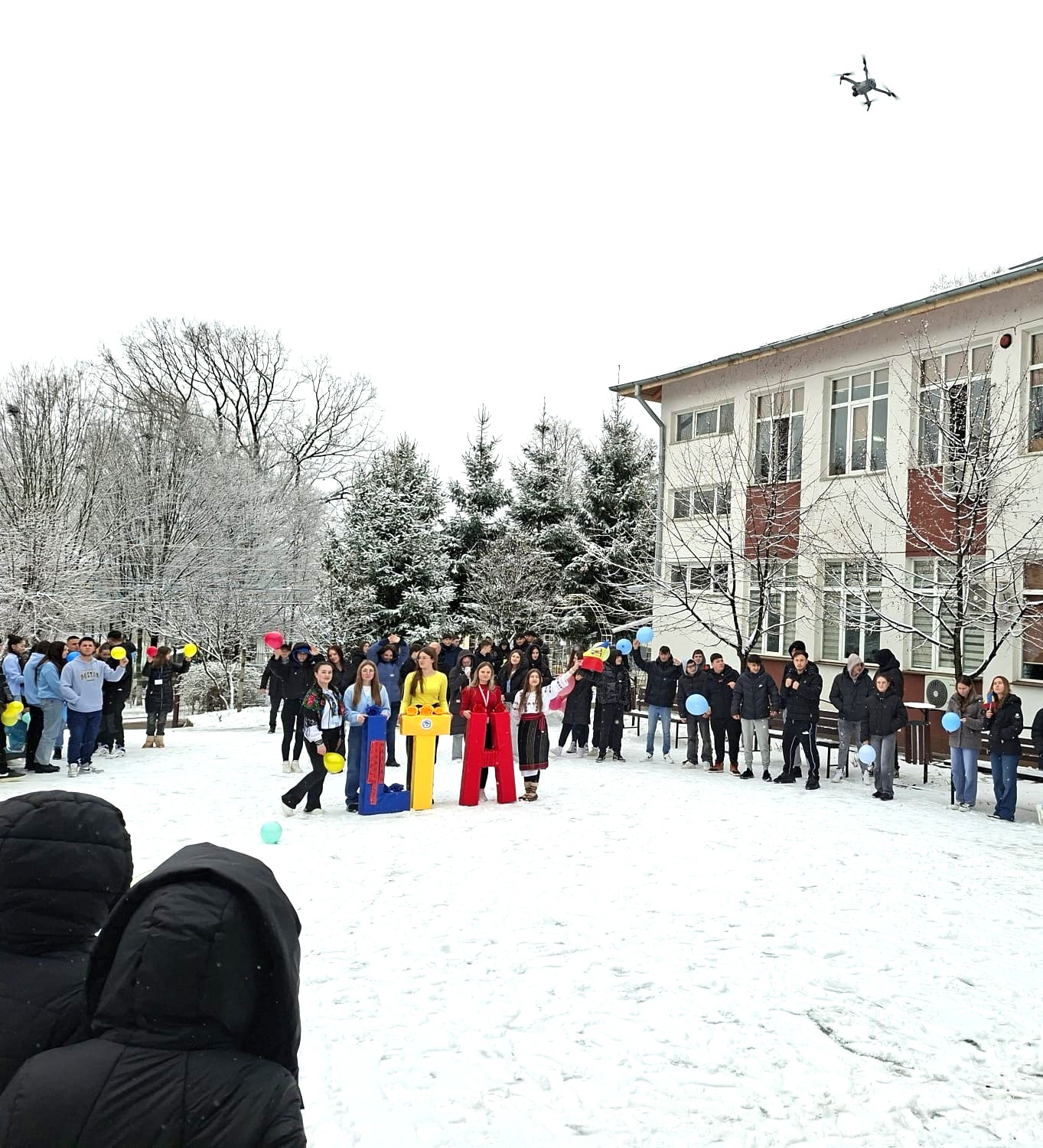Mândri că suntem români: elevii și cadrele didactice de la liceul nostru au marcat această etapă esențială pentru constituirea statului național unitar român, cântând și jucând „Hora Unirii” în curtea liceului, cu mult entuziasm și veselie, într-un decor de iarnă autentică!